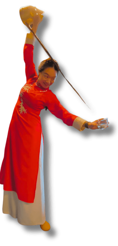 Su manejo requiere precisión, concentración y un movimiento casi acrobático que convierte el servicio del té en un espectáculo.